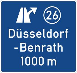| Keywords: Zeichen 448 - Ankündigungstafel auf Autobahnen, StVO 1992.svg Zeichen 448 “ Ankündigungstafel auf Autobahnen nach RWBA StVO 1992 Sign No 448 “ announcement of interchange on motorways Image taken from the de Straßenverkehrsordnung German Road Regulations as published by the de Bundesministerium für Verkehr Bau- und Wohnungswesen German Federal Ministry of Traffic Building and Housing at http //www bmvbw de/Verkehr/Strasse- 1449/Strassenverkehrs-Ordnung htm own Andreas06 Mediatus 01 August 2006 Hochladedatum + Signs <gallery> File Zeichen 448 - Autobahnausfahrt-Ankündigungstafel - 1000 m StVO 1970 svg </gallery> User Mediatus/no-new-version Cc-zero PD-VzKat SVG road signs in Germany Diagrams of motorway road signs of Germany 2000 set 448 svg Diagrams of direction road signs of Germany 2000 set 448 svg Düsseldorf-Benrath Road signs in Düsseldorf Exit number road signs |