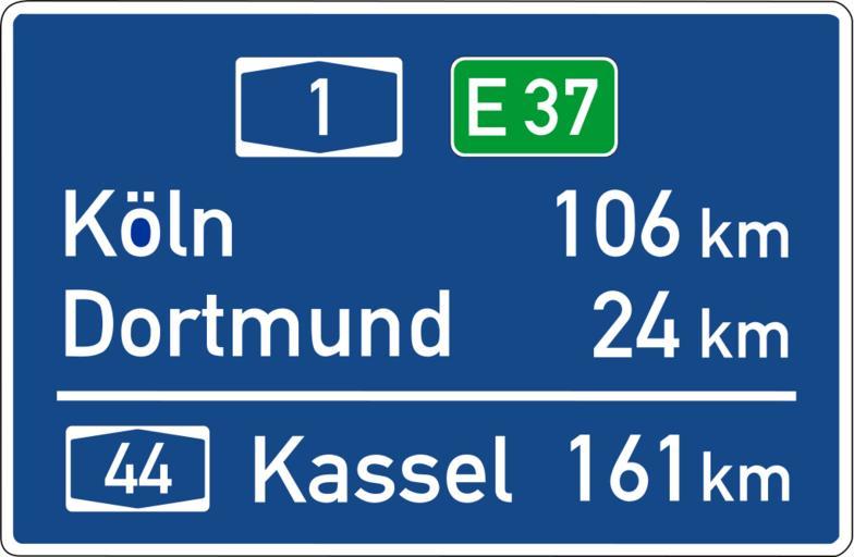 | Keywords: Zeichen 453.svg Zeichen 453 “ Entfernungstafel Sign No 453 “ destinations and distances Image taken from the de Straßenverkehrsordnung German Road Regulations as published by the de Bundesministerium für Verkehr Bau- und Wohnungswesen German Federal Ministry of Traffic Building and Housing at http //www bmvbw de/Verkehr/Strasse- 1449/Strassenverkehrs-Ordnung htm own Andreas06 01 August 2006 Hochladedatum <gallery> File Zeichen 453 - Autobahn - Entfernungstafel StVO 1970 svg </gallery> PD-GermanGov Cc-zero PD-VzKat Bundesautobahn 1 Entfernungstafel Bundesautobahn 44 Entfernungstafel E37 Diagrams of direction road signs of Germany 453 svg Diagrams of direction road signs of Germany 1992 set 453 svg Diagrams of motorway road signs of Germany Entfernungstafel |