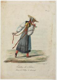 | Keywords: Zentralbibliothek Solothurn - Canton de Soleure Femme du Village de Dornach - a0767.tif  Junge Frau von schräg hinten in Tracht Sie trägt sehr lange Zöpfe und Rosen in der Hand Jeune femme vue obliquement par derrière en costume Elle porte de très longues tresses et des roses à la main Woman from the village of Dornach Young woman seen obliquely from behind in costume She wears very long braids and has roses in her hand between 1820 1840 Technique Lithograph paper colored Size mm 158 162 institution Zentralbibliothek Solothurn object history credit line accession number Call number a0767 Zentralbibliothek Solothurn Public domain Information field ZBS form heading Trachtenbild Information field ZBS form heading Ganzfigurenbild Zentralbibliothek Solothurn PD-old-70-1923 Historical images of Dornach Traditional costumes of the canton of Solothurn François-Séraphin Delpech |
