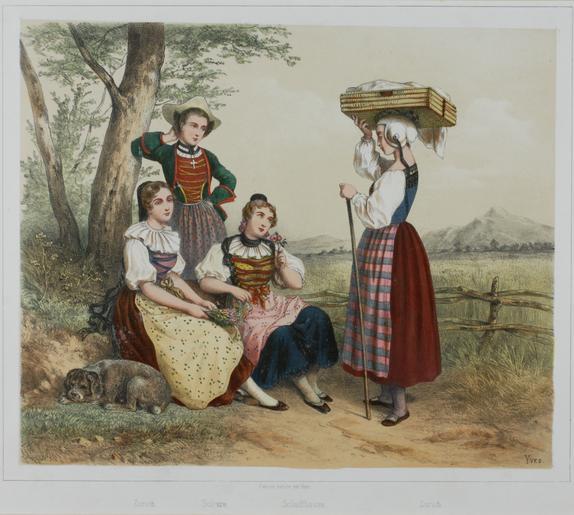 Keywords: Zentralbibliothek Solothurn - COSTUMES SUISSE - aa0090.tif An einem Weg sitzen und stehen vier Mädchen in Trachten zwei haben Blumen in der Hand eine einen Korb auf dem Kopf neben ihnen ein schlafender Hund im Hintergrund offene Landschaft mit Bergen Unter den Trachtenfiguren die Bezeichnungen Zurich Soleure Schaffhouse Zurich Sitting at a road are four girls in costumes two have flowers in hand one a basket on her head with a sleeping dog beside them in an open landscape with mountains in the background Among the costumed characters are the names Zurich Solothurn Schaffhausen Zurich Sur le bord de la route sont assises quatre filles en costumes deux ont des fleurs à la main l'une avec un panier sur la tête avec un chien qui dort à côté d'eux dans un paysage ouvert avec les montagnes en arrière-plan Parmi les personnages de costumes les marques Zurich Soleure Schaffhouse Zurich between 1800 1830 Technique Lithograph paper colored Size mm 246 202 institution Zentralbibliothek Solothurn object history credit line accession number Call number aa0090 Zentralbibliothek Solothurn Public domain Information field ZBS form heading Trachtenbild Information field ZBS form heading Ganzfigurenbild Zentralbibliothek Solothurn PD-old-70-1923 Historical images of Solothurn people Traditional costumes of the canton of Solothurn Traditional costumes of the canton of Zürich Traditional costumes of the canton of Schaffhausen |
