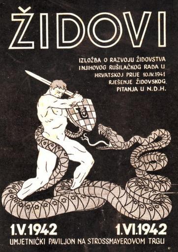 | Keywords: Židovi izložba ndh 1942.jpg hr Plakat kojim se najavljuje antisemitska izložba u NDH održana od 1 svibnja do 1 lipnja 1942 en World War II poster announcing an antisemitic exhibition in Zagreb held from 1 May to 1 June 1942 in the Art Pavilion The poster reads Jews - Exhibition about the development of Jewry and their destructive work in Croatia prior to 10 April 1941 - solving the Jewish question in the Independent State of Croatia 2012-11-29 20 22 53 http //www serbianna com/columns/savich/084 shtml Serbianna State Propaganda Office Independent State of Croatia 1941-1945 Custom license marker 2012 11 30 PD-Croatia Anonymous-EU Uploaded with UploadWizard Propaganda posters of Independent State of Croatia Antisemitic pictures People with snakes in art |