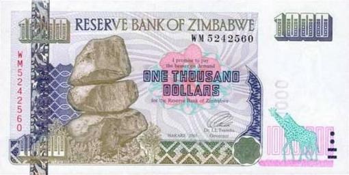 Keywords: Zimbabwe $1000 2003 Obverse.jpg This is the obverse of a paper banknote of the Zimbabwe Dollar en wikipedia 2008-10-29 Mangwanani wikipedia en PD-ZW-currency original upload log page en wikipedia Zimbabwe_ 241000_2003_Obverse jpg 2008-10-29 13 51 Mangwanani 550×284× 30521 bytes <nowiki> Summary This is an image of the front of the paper Zimbabwe dollar which circulated from 2001 and 2004 Use of this image in article Banknotes of the Reserve Bank of Zimbabwe is believed to be fair use because It adds </nowiki> Banknotes of Zimbabwe 1994-2003 Banknotes with a face value of 1000 Giraffes on banknotes Blue banknotes of Zimbabwe |