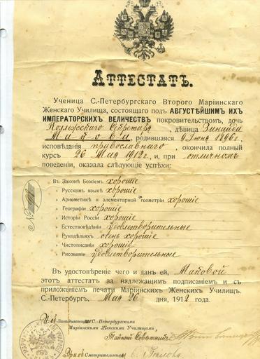 | Keywords: Zinaida-Makova-attestat.jpg ru Аттестат об окончании полного ку са Санкт-Пете бу гского Вто ого а иинского женского училища выдан Зинаиде Ивановне аковой 1912-05-26 Own family archive Not applicable PD-RusEmpire Uploaded with UploadWizard Nikolai Ivanovich Makov Educational documents of the Russian Empire |