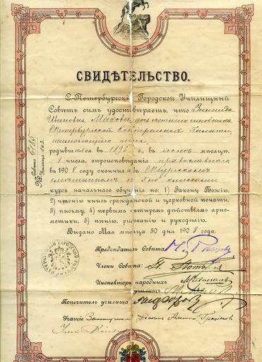 | Keywords: Zinaida-Makova-svidetelstvo.jpg ru Свидетельство об окончании Зинаидой Ивановной аковой сест ой ленинг адского поэта иколая Ивановича акова 5 классов Санкт-Пете бу гского смешанного училища 30 мая 1908 года 1908-05-30 Own family archive Not applicable PD-RusEmpire Uploaded with UploadWizard Nikolai Ivanovich Makov Documents of the Russian Empire |
