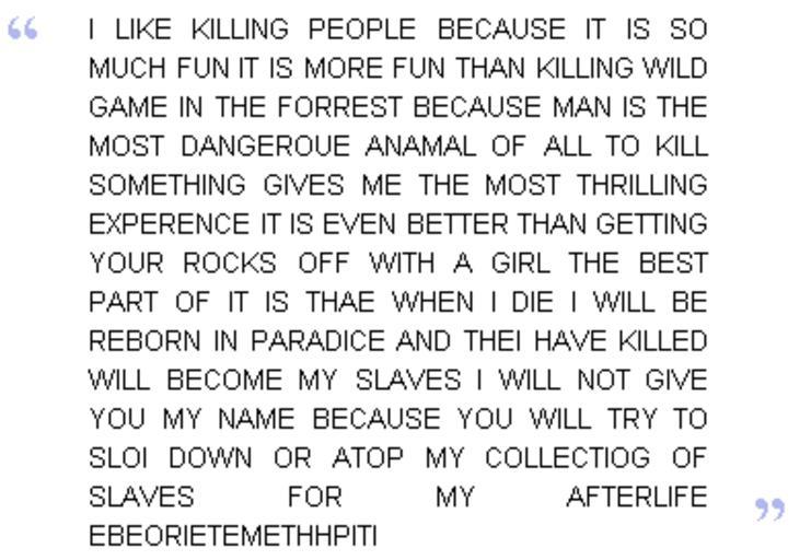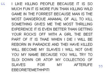 | Keywords: Zodiac cipher.png  page is/was here Original uploader was Anastrophe at http //en wikipedia org en wikipedia Anastrophe wikipedia en Anastrophe Image of Zodiac cipher text For those without image capability the text reads I LIKE KILLING PEOPLE BECAUSE IT IS SO MUCH FUN IT IS MORE FUN THAN KILLING WILD GAME IN THE FORREST BECAUSE MAN IS THE MOST DANGEROUE ANAMAL OF ALL TO KILL SOMETHING GIVES ME THE MOST THRILLING EXPERENCE IT IS EVEN BETTER THAN GETTING YOUR ROCKS OFF WITH A GIRL THE BEST PART OF IT IS THAE WHEN I DIE I WILL BE REBORN IN PARADICE AND THEI HAVE KILLED WILL BECOME MY SLAVES I WILL NOT GIVE YOU MY NAME BECAUSE YOU WILL TRY TO SLOI DOWN OR ATOP MY COLLECTIOG OF SLAVES FOR MY AFTERLIFE EBEORIETEMETHHPITI Files uploaded but not created by User Gridge Zodiac killer English text |