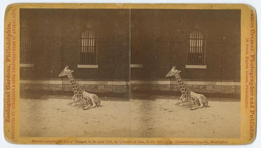 Keywords: stereographs philadelphia zoos zoological society zoologicalsociety zoological garden zoologicalgarden fairmount park fairmountpark giraffes animals james cremer jamescremer Shows a giraffe lying in a cage at the Zoological Garden in Fairmount Park, Philadelphia, 1875. A window covered in bars is visible on the wall behind the giraffe. Accession number: P.2011.47.1621 Shows a giraffe lying in a cage at the Zoological Garden in Fairmount Park, Philadelphia, 1875. A window covered in bars is visible on the wall behind the giraffe. Accession number: P.2011.47.1621
