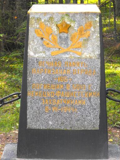 | Keywords: Zorin-otryad-106-1a.jpg ru Памятник па тизанам от яда 106 убитым в последнем бою 6 июля 1944 года Возведен в 1964 году в алибокской пуще бывшим команди ом от яда Шоломом Зо иным вместе с боевыми това ищами 2012-09-05 13 41 13 own Avner 53 47 13 4 N 26 13 57 5 E heading E cc-zero Uploaded with UploadWizard Sholom Zorin |
